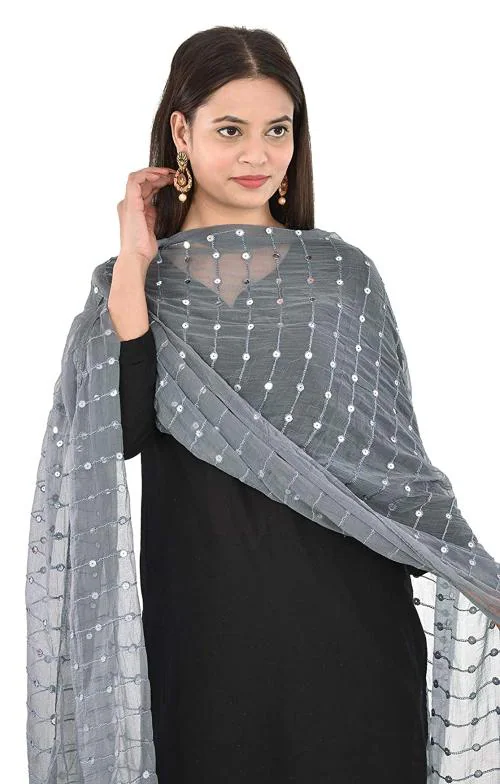 Kemza Women's Mirror Chiffon Dupatta (Grey) with Embroidered Work