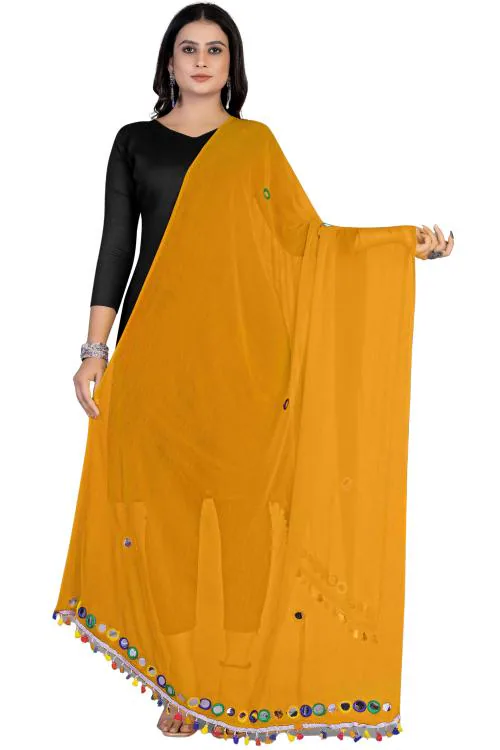 Kemza Women's Plastic Mirror Work Chiffon Dupatta (Mustard) with Multicolor Threads