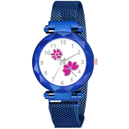 KIARVI GALLERY Analogue Blue Flower Dial Blue Magnetic Metal Strap Watch For Girls and Women