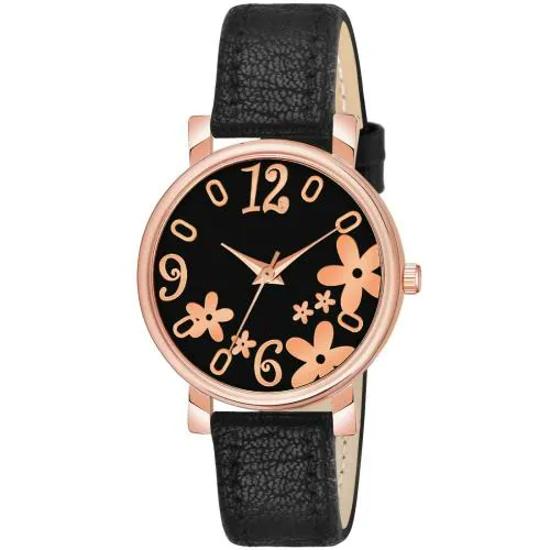 KIROH Analog Flower Designer Dial Stylish premium Leather Strap Watch For Girls and Women(Black)