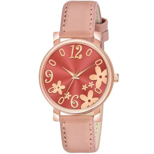KIROH Analog Flower Designer Dial Stylish premium Leather Strap Watch For Girls and Women(Pink Dial-Peach)