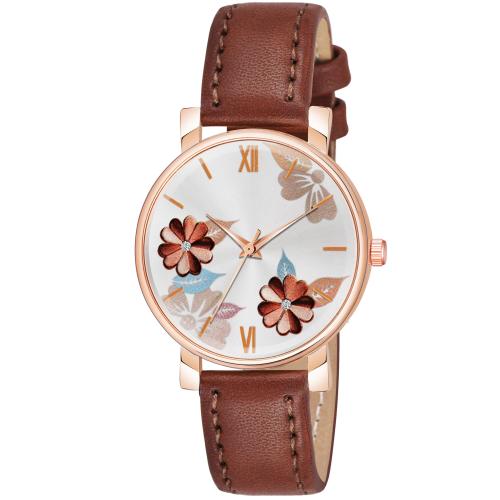 KIROH Brown Flower Dial Leather Strap Analogue Watch For Girls and Women