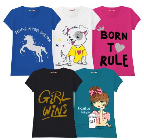 KUCHIPOO Girls Printed Cotton Blend Pack of 5 Tshirts | Tshirt | Kids Wear | T shirt for kids | Girls t tshirts | T shirt for Girls | T shirt | Girl T-shirt | T-shirt Girls