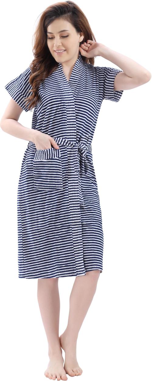 Lacylook Women Navy Blue Striped Terry Bath Robe