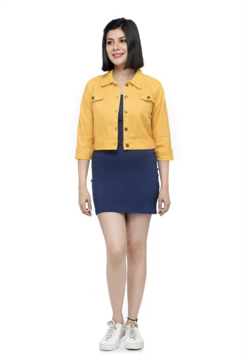 Lambency Women Yellow Solid Cotton Blend Denim Jacket