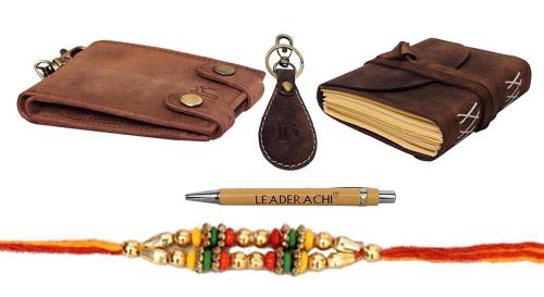 - Rakhi gift for brother – make this raksha bandhan celebration explicitly love-laden by bringing home for your brother, these top trending sleek and gorgeous rakhis and rakhi hampers, rakhi combo gift sets by leaderachi. The rakhi hampers include a mens leather wallet with leather journal diary , leather keyring ,wooden pen and a beautiful rakhi.