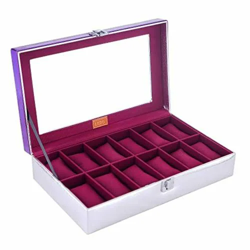 LEDO Watch Box Case Organizer with Transparent Display in 12 slots of Watches Silver and Purple color