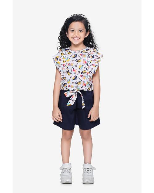 Lilpicks Girls Bird Print Ruffle Top With Navy Belted Shorts Set
