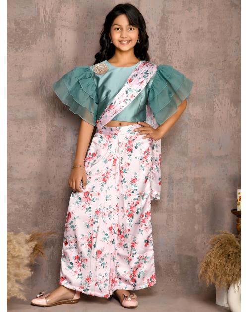 Lilpicks Girls Frill Sleeve Blouse With Floral Print Saree