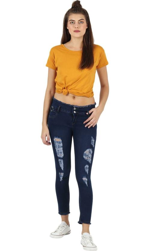LIVE OK Women Dark Blue Self Design Cotton Polyester Lycra Blend Skinny Jeans