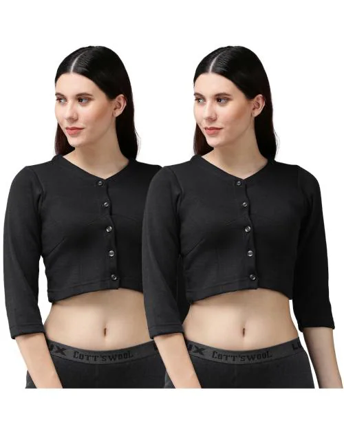 LUX COTT'S WOOL Women's Black Solid Cotton Blend Pack Of 2 Thermal Tops