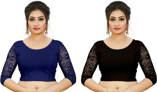 LYNETH Women Black and Navy Solid, Self Design Cotton Blend (Pack of 2) Blouse, Size 30