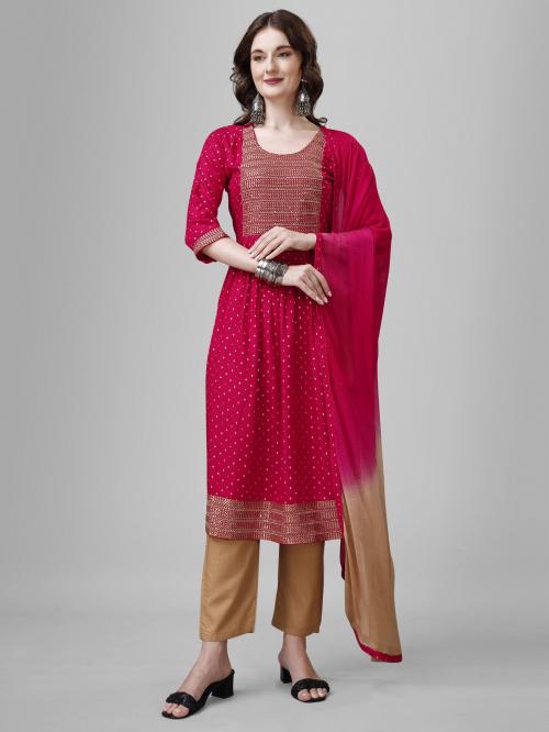 "M" And "F" MITTAL FASHION Women Pink Embroidered Kurti Cotton Rayon Kurta Pant Set With Dupatta (L)