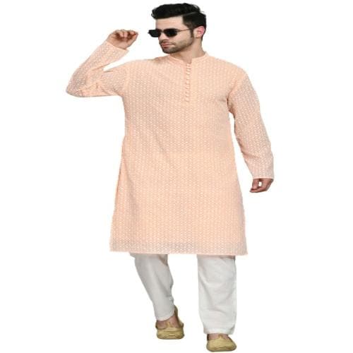 MAFE Men's Georgette Chikankari Kurta With Pant For Elegant Traditional Wear (Peach) - XX-Large