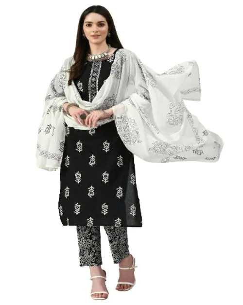 MAFE Women's Cotton Kurta, Pant And Dupatta Set Printed Suit For Wedding And festival (Black)