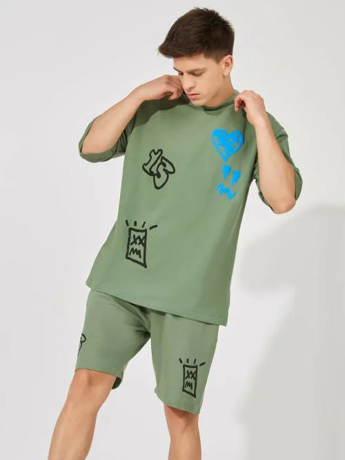 Maniac Mens All Over Printed Round Neck Half Sleeve Green Tshirt and Shorts Cotton Co-Ords