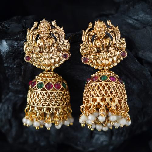 Mansiyaorange South Indian Temple Matte Gold Red Ruby And Green Color Stone Creame Pearl Drop Earrings Stud Jhumki Earrings For Women