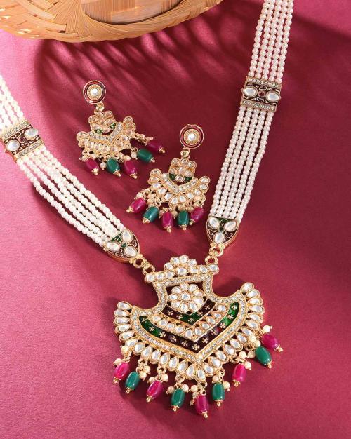 Meenakari Bridal Multistrand Pearls Necklace & Earring Set - ZPFK14474