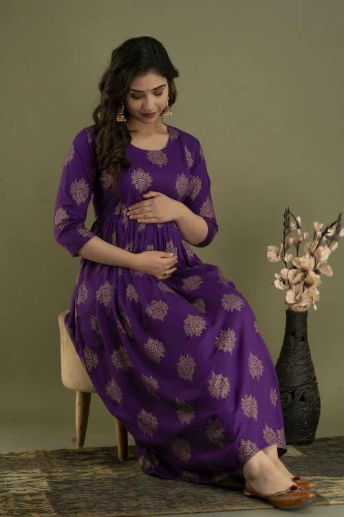 Mialo Fashion Women Purple Printed Cotton Rayon Blend Maternity Kurta