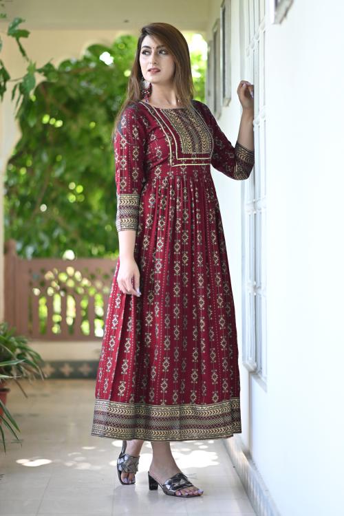 Mintmarie Women's Printed Anarkali Kurti (Maroon)