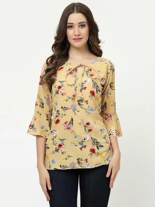 MISS AYSE Trendy Fancy Beige Color Crepe Tie Up Neck Top