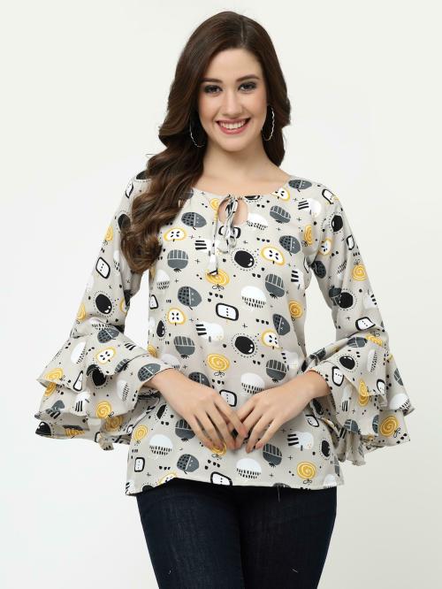 MISS AYSE Trendy Fancy Grey Color Crepe Tie Up Neck Top