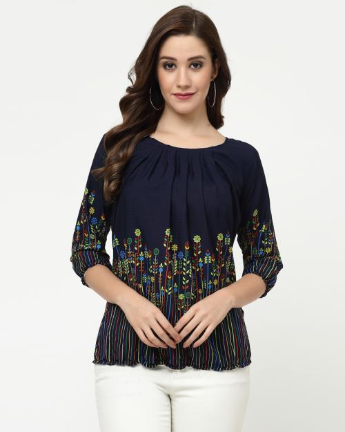MISS AYSE Western Blue Crepe Round Neck Top