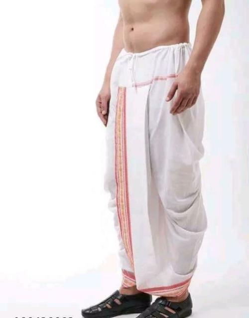 MJBROTHERS Men's Ethnic Pure Cotton Readymade Dhoti With Golden Lace-WHT