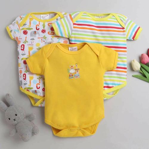 MM IMPEX Baby Boys and Girls Yellow Striped, Printed Cotton Blend (Pack of 3) Romper 3-6 MONTHS| Rompers |Sleepsuits | Jumpsuit |Body suits