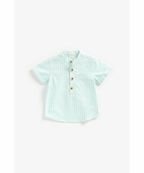 - short-sleeved shirt;grandad collar;contrast coloured neck tape;button fastening;shaped hem