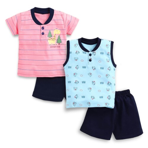 mustmom Infant Baby Soft Cotton Comfy Casual T-Shirt Sleeveless Vest with shorts combo set Pink Blue