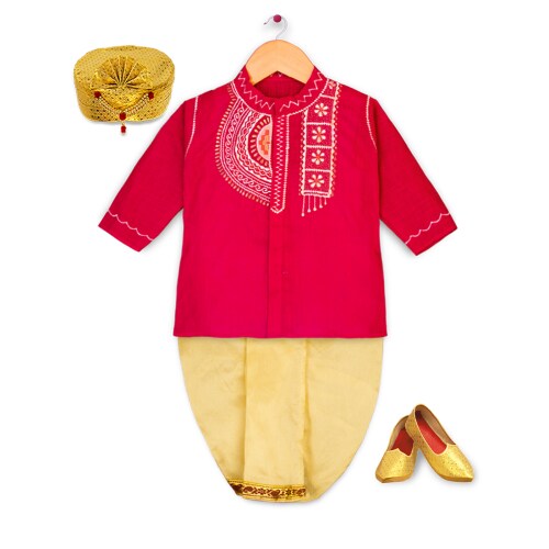 mustmom Rice Ceremony pure cotton Dhotiset of 1 kurta dhoti cap and 1 pair of shoe Red