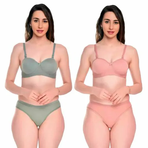 N-KUWARI Women Half cup Lightly Padded and Non Wired Bra Panty set (Pack Of 2) -(Green&Pink)-36B