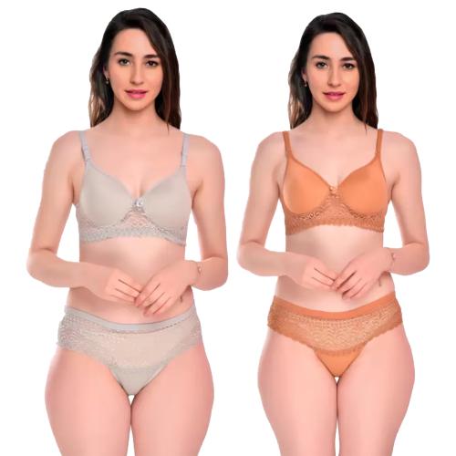 N-KUWARI Women's Cotton Lace Net Honeymoon Lingerie Set | Bra & Panty Set-Grey & Brown -(Pack of 2) (34B)
