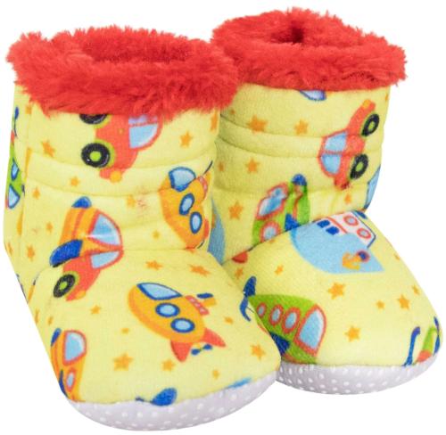 - pack of 1 yellow baby booties with inside towel cotton base, velvet and fur outside and anti skid silicon gel sole,printed cars,plane,ship baby booties