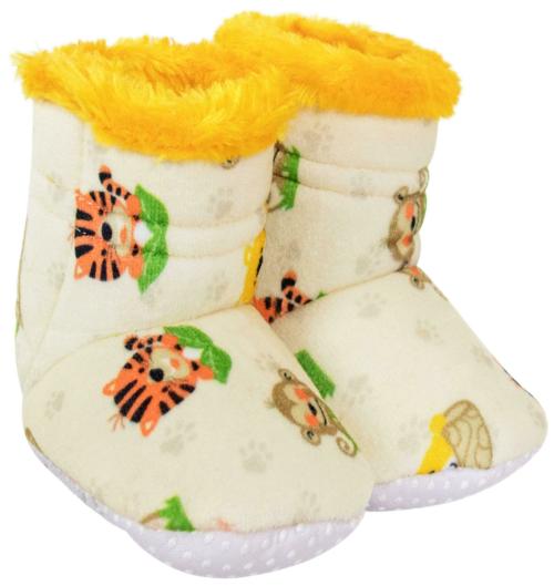 - pack of 1 beige baby booties with inside towel cotton base, velvet and fur outside and anti skid silicon gel sole, animal printed baby booties
