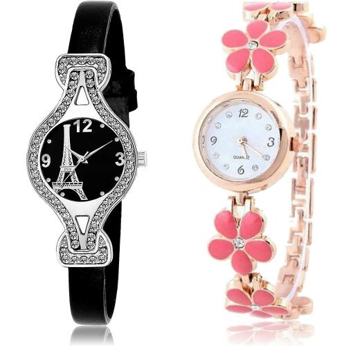 NEUTRON Best Designer Casual Paris Eiffel Tower And Flower Black And Rose Gold Colour Analog Genuine Leather And Stainless Steel Belt 2 Watch Combo For Women And Girls - G621-G461