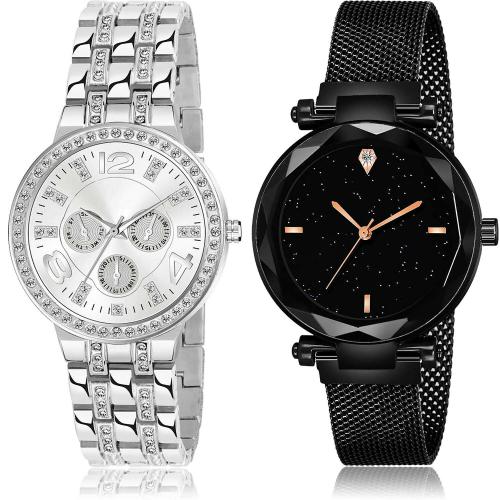 NEUTRON Latest Analogue Chronograph Chain And Magnet Silver And Black Colour Analog Metal And Stainless Steel Belt 2 Watch Combo For Women And Girls - G629-GC1
