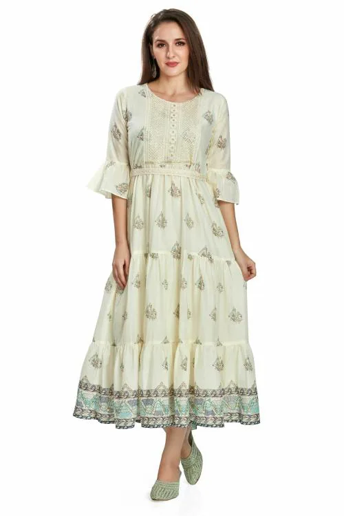 - Whether you're attending a wedding, a garden party, or a special celebration, our Cream White Ethnic Maxi Dress with 3/4th Sleeves is the perfect choice for modern women seeking both style and comfort.