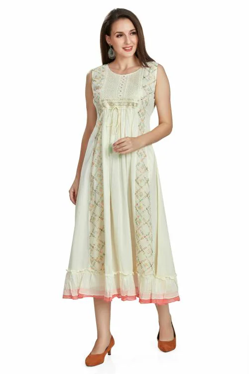 - Style: Ethnic | Length: Calf Length | Type of sleeves: Sleeveless | Neck style: Round | Colour: White Peach |work: Chikankari work