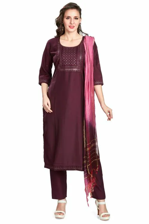 nioni Women's Fancy Salwar Suit Set with Dupatta, 3/4 Sleeves, Solid Kurti with Chikanwork for Girls and Woman (Wine, XL)