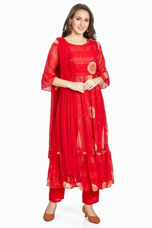 nioni Women's Fancy Salwar Suit Set with Solid Dupatta, 3/4 Sleeves, A Line Printed Kurta with Embroidery on Neck Line for Girls (Red, M)