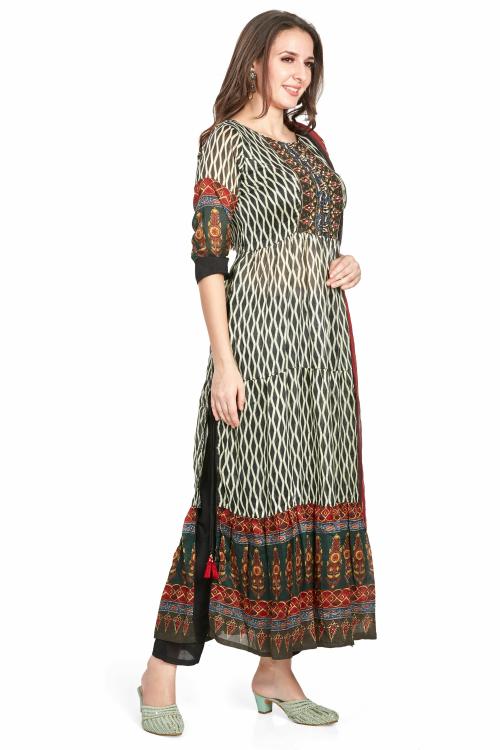 - PATTERN: Hand embroidery on front side of printed kurta || LENGTH: Full Length || TYPE OF SLEEVES: 3/4 Sleeves || NECK STYLE: Round || COLOUR: Black and Grey.
