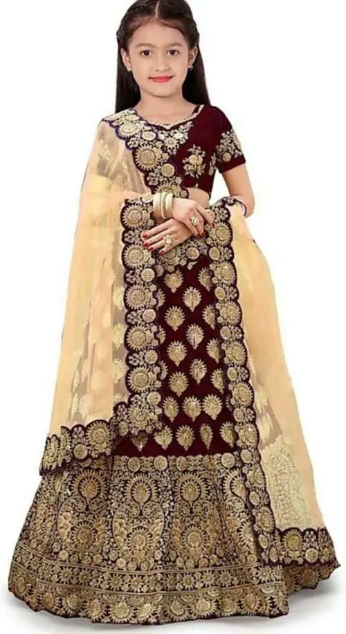 NIVUDI Baby Girls Maroon Embroidered Satin, Tissue Lehenga Choli and Dupatta Set (5 to 6 Years)