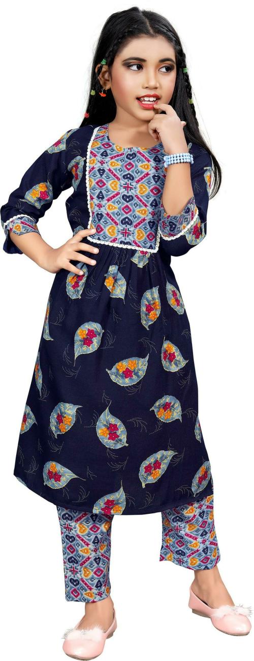 NIVUDI Girls Blue Printed Pure Cotton Kurta and Trouser Set (8 to 9 Years)