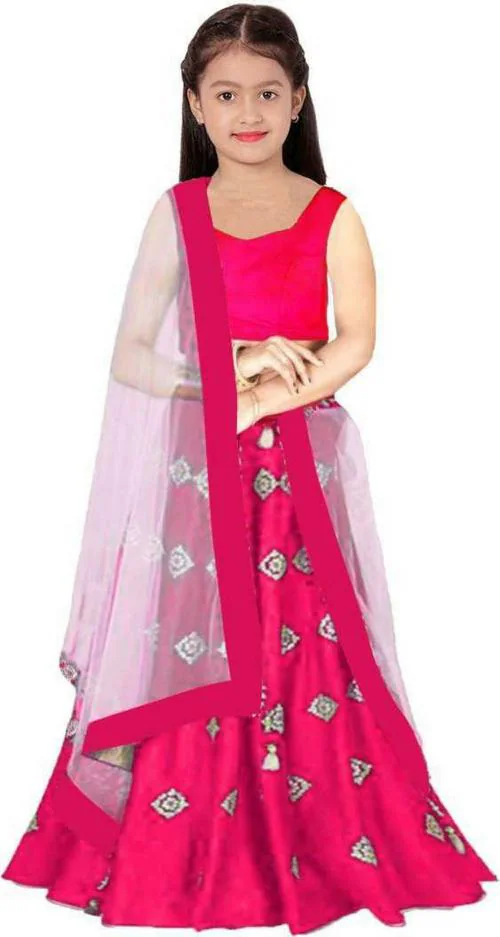 NIVUDI Girls Pink Embroidered Satin, Tissue and Taffeta Lehenga Choli and Dupatta Set (5 to 6 Years)