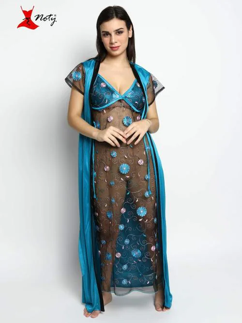 Noty Women's Nightwear Set Nighty with Robe Satin Fabric Honeymoon Netted Nighty with Robe (Fiery Ferozi, Free Size)