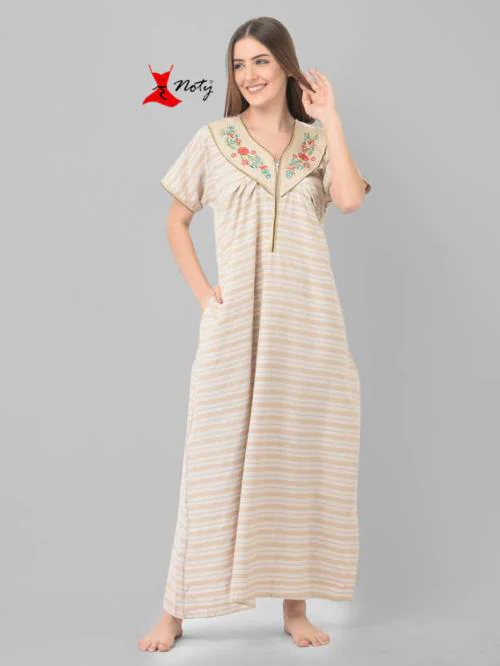 Noty Women's- Nighty/Maxi/Gown- Cotton Fabric- Self Striped-Pocket with V-Neck with Zip, Embroidery and Belt (Beige, Free Size)