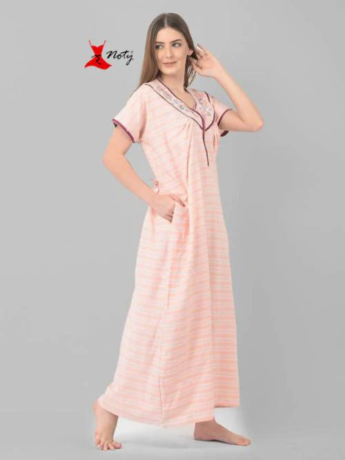 Noty Women's- Nighty/Maxi/Gown- Cotton Fabric- Self Striped-Pocket with V-Neck with Zip, Embroidery and Belt (Orange, Free Size)