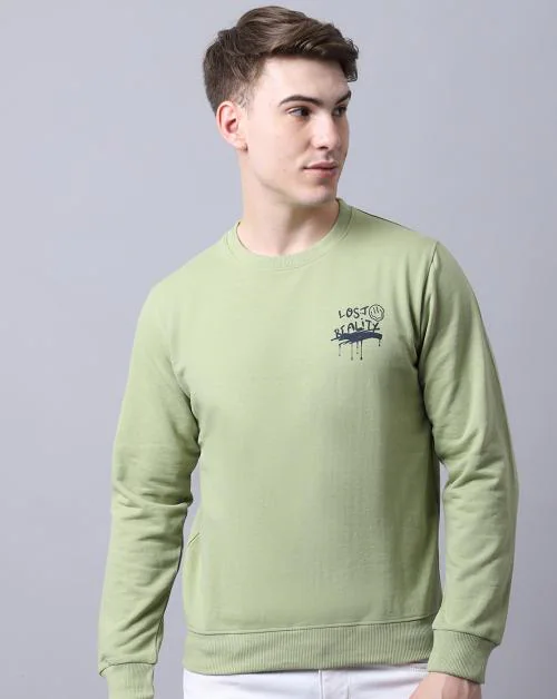 OBAAN Men Pista Green Printed Round Neck Fleece Sweatshirt